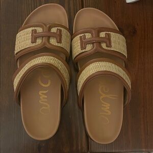 Slip-on Rowan slide sandals by Sam Edelman with raffia woven straps. Smooth tan leather trim and accents. Cushioned footbed with subtle gold logo. Easy summer style for everyday wear.