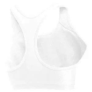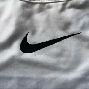 Lightweight racerback sports bra for training. Breathable stretch fabric for comfort. Center black Nike swoosh logo. Simple, athletic silhouette.