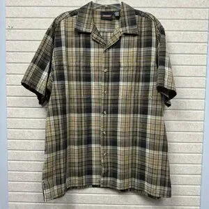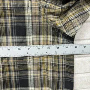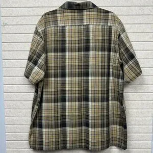 Dickies men’s short sleeve windowpane plaid work shirt in size XL. Classic brown and black plaid pattern giving versatile workwear or casual-wear styling. Button-up collared design, short sleeves — great for warm weather or layering under a jacket. Pre-owned but in good condition (see photos for any wear and exact flat-lay measurements).