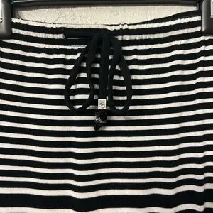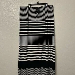Michael Kors maxi skirt with horizontal black and white stripes. Elastic waist with drawstring for a flexible fit. Lightweight knit fabric with smooth drape. Classic stripe pattern for versatile styling.