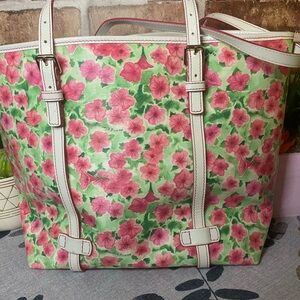 This vibrant bag is the Dooney & Bourke Petunia Floral Shopper Tote, part of a retired floral collection. It features a watercolor-style pink petunia print on a green leafy background. Clean no call outs and no rubbing no Coa