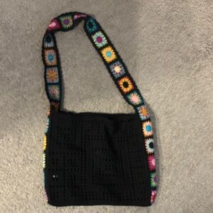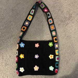 This vibrant crochet shoulder bag features a playful floral design. Perfect for adding a pop of color to any outfit.