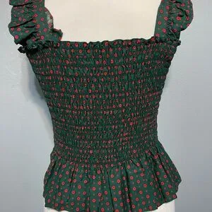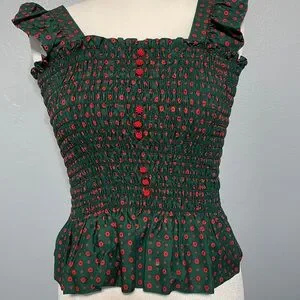Elegant green maxi skirt with a playful red floral print. Features a feminine ruffle detail at the waist and a comfortable gathered elastic top. Lightweight and versatile for everyday wear. Red floral pattern on green adds a classic, eye-catching contrast.