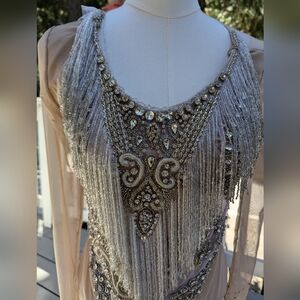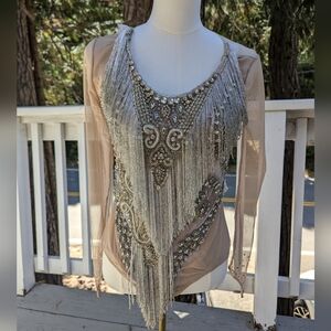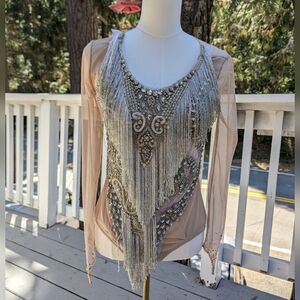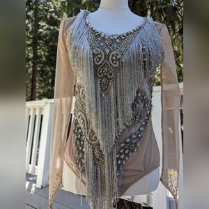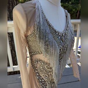 Color: Nude base with silver rhinestone embellishments and dramatic silver fringe