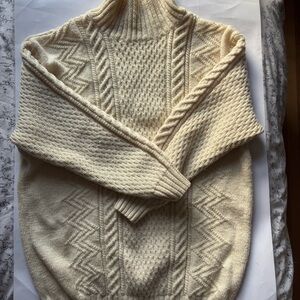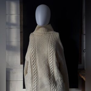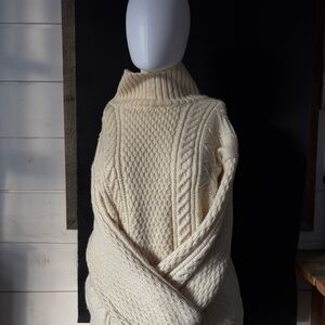 Chunky cable-knit sweater with a high turtleneck. Textured center panel and braided side cables. Thick, cozy silhouette for cool weather. Neutral cream tone pairs with many looks.