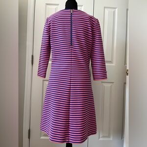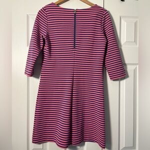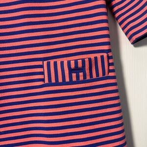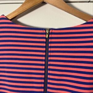 Chic coral and navy striped three-quarter sleeve dress by Lilly Pulitzer. Features a back zipper. Please note that a button is missing on the front pocket (see photo). Otherwise in excellent condition!