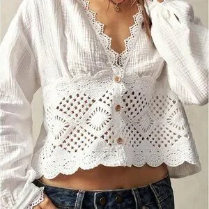 This dreamy boho blouse is soft, breathable, and full of romantic details. The lace-trimmed deep V neckline, airy lantern sleeves, and crochet-style paneling make it the perfect statement top for casual days or dressed-up nights.