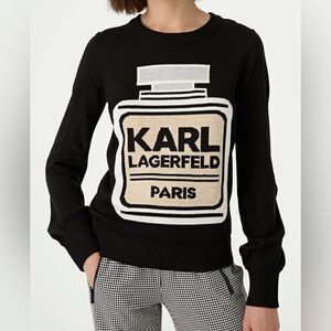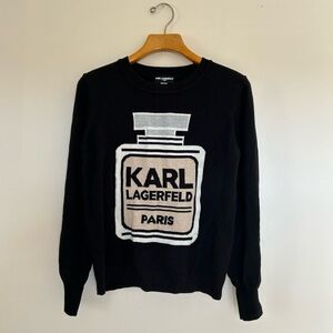 Chic black sweater with a striking bottle graphic. Features bold Karl Lagerfeld branding. Soft, nice feel. Size medium, in good condition. Iconic perfume bottle sweater!