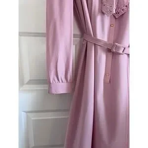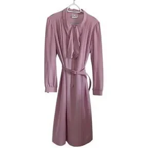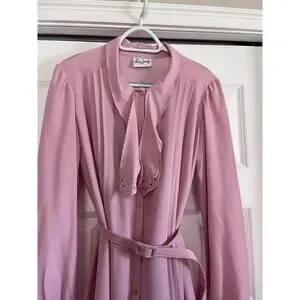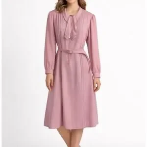 Step into timeless elegance with this vintage Lady Jennifer pink midi dress featuring delicate pleats, a scalloped edge tie collar, and long sleeves with button cuffs. The lightweight fabric drapes beautifully, making it ideal for vintage-inspired outfits, tea parties, or formal occasions. The dress is in excellent condition; the matching belt shows some wear but still functions. Size tag not visible - please refer to measurements for best fit.
