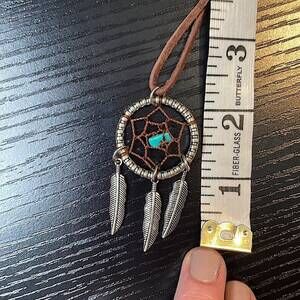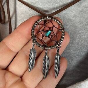 -I paired a stainless steel Native American style dream catcher pendant and faux turquoise stone with a genuine suede leather lace to create this piece