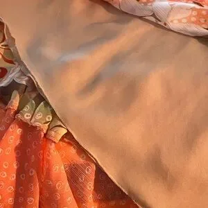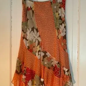 Stylish asymmetrical skirt with vibrant floral patterns. Features a mix of orange and brown tones. Perfect for a bold fashion statement. Skirt is 28” long