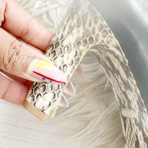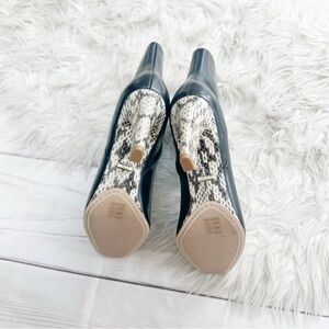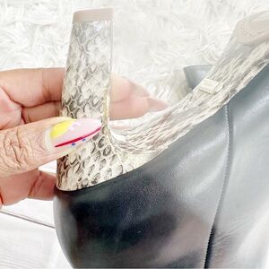 The ankle boot is a key transitional piece and this season's directive reads; the more striking the better. The Sophie style in black is crafted to a sleek almond-toe silhouette with a high heel and it features a snake-skin detail that gives it an edge.