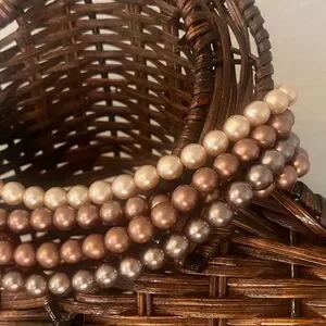 This is a very, rich-looking, vintage, mid-century 1950s, multi-strand, faux-pearl, choker/necklace stamped Japan. It is a 4 strand, graduated, pearl necklace that adjusts from 14.5 to 17 inches in length. I am not sure of the fake-pearl content, but they are heavy so perhaps their base is made of alabaster I dont know. It is comprised of 1 copper strand, 2 beige strands & 1 off-white/cream strand of very, lustrous pearls that fall & drape elegantly. The pearls are strung on beading thread and the findings and J-hook are made of silver-tone metal. This type of classic, pearl necklace never goes out of style and this beauty is in excellent condition.