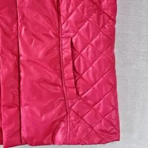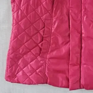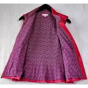 Lilly Pulitzer Puffer Vest in size Medium is a stylish and practical piece for women. This hot pink quilted vest is made with polyester outer shell and filled with polyester insulation, making it perfect for staying warm in colder seasons. The zip closure, sleeveless design, and machine washable fabric make it convenient for travel and casual occasions. The Lilly Pulitzer brand adds a touch of designer flair to this classic and preppy piece, making it a standout addition to any wardrobe.