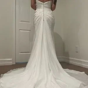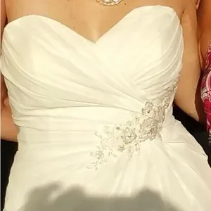 Alfred Angelo strapless bridal gown with a sweetheart neckline. Softly ruched bodice gathers to one side. Subtle crystal-embellished applique accents the waist. Smooth flowing skirt creates an elegant silhouette.