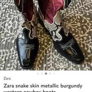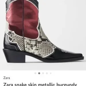 Bold Western-style ankle boots by Zara. Red leather shaft with black toe and accents. Snake-print panels add texture and contrast. Pointed toe and decorative stitching for a sharp look.