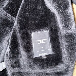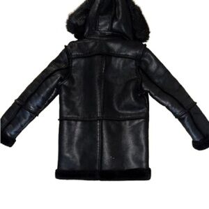 Luxurious black jacket with fur lining. Features a cozy hood and sleek design.