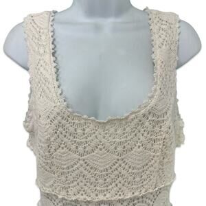 Details: White crochet mini dress with a scoop neckline, sleeveless silhouette, and a banded open knit waist. Criss cross straps and a back cutout create a flirty warm weather look. Scalloped floral trim adds texture throughout. Fully lined except at the waist. Shell is 89% cotton and 11% polyester with a 100% polyester lining. Style W42GDFMC233. Ships within 2 business days. All sales final.