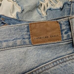 American Eagle 90s Boyfriend Shorts in a light wash denim featuring heavy distressing and a raw, frayed hem. These high-waisted shorts are crafted from 100% cotton for a classic non-stretch feel, offering a relaxed fit through the hip and thigh. Design details include a button fly, five-pocket styling, and signature leather brand patch at the back waist.