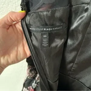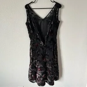 Add a touch of romance to your wardrobe with this stunning White House Black Market midi dress. Featuring a sophisticated black base with an all-over floral velvet burnout pattern in rich tones of burgundy, plum, and charcoal, this dress offers a flattering silhouette perfect for special occasions or a night out.