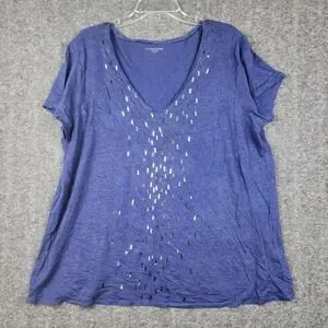 Eileen Fisher Linen Top Woman 1X Blue V-Neck Sequin Embellished Short Sleeve