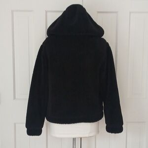Carbon38 Full Zip Hooded Teddy Bomber Jacket in Black. 65% polyester & 35% viscose with 100% polyester lining. Adjustable straps in hood & at bottom of hem. Collared with side pockets. 24 inches in length & 20 inches from armpit to armpit. Size Small. Worn a few times, in great condition. No flaws