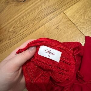 Bright red dress with thin spaghetti straps. Knit midsection adds texture and slight sheerness. Flirty skirted hem for feminine flair. Simple, chic and gorgeous. Size xs.