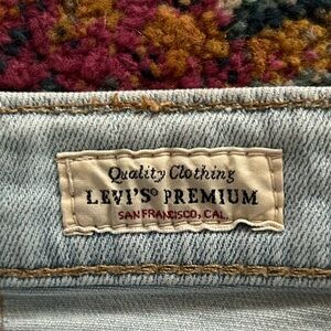 Levi’s | Men’s light blue denim 512 Premium cut off jeans shorts. Zipper/button front closure, front and back pockets, leather back patch, raw hems. Machine wash cold, 92% cotton, 6% polyester, 2% elastane. Men’s waist size 34