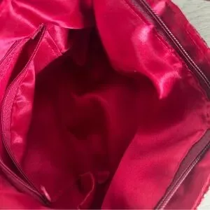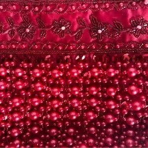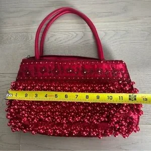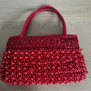 Beautiful vintage beaded handbag featuring rich red satin with intricate layered beadwork. The bag is embellished with glossy pearl like and faceted beads that create stunning texture, sparkle, and movement. The lower portion features dramatic cascading beaded fringe, giving the bag a bold statement look perfect for evening events, parties, weddings, or holiday occasions.