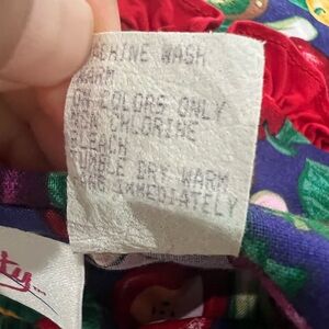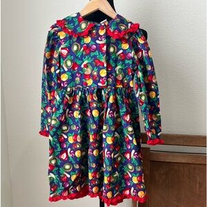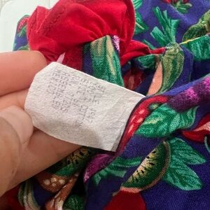 Colorful fruit-print costume dress with long sleeves. Features vibrant blue and green background with multicolored fruit motifs and red ruffle trim. Soft, playful design that’s easy to wear for dress-up and parties. Bright red accents add a fun pop to the overall look. Top Button a little loose may need to sew it back in place