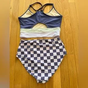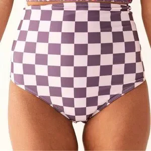 Two-piece women's bikini with a supportive mulberry crop tank top and high-rise checkered bottoms. Features cream and pale-cream band accents for a modern contrast. Comfortable, flattering fit designed for all-day beach or pool wear.