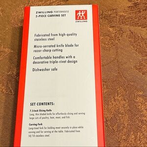 Upgrade your kitchen tools with this premium Zwilling J.A. Henckels Porterhouse 2-Piece Carving Set, brand new and still in the original packaging.