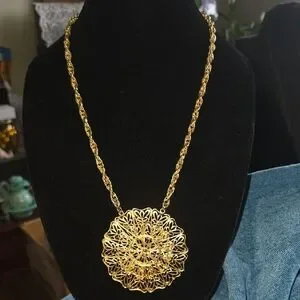 Vintage Elegant gold filigree medallion pendant on a twisted rope chain. Lightweight statement piece that enhances any outfit. Features a detailed floral-inspired design in gold. Perfect for gifting or everyday wear.