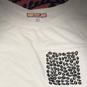 Cream elbow length short-sleeve tee with a square chest pocket covered in jeweled embellishments. Subtle shine from the stones. Easy, chic addition to casual outfits.
