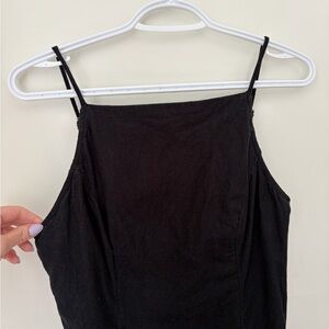Chic black mini dress with a sleek silhouette. Perfect for versatile styling.