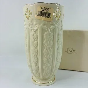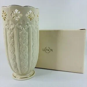 Lenox Fleur de Lis Collection Embossed Pierced Flower Vase Ivory Gold Made in USA 7.5"