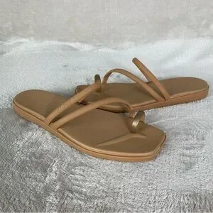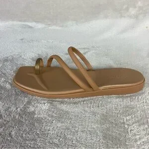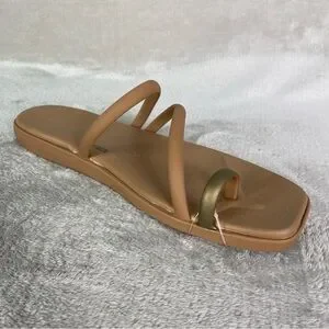 Details: Easy slip-on entry with asymmetrical double straps and toe loop that help secure the forefoot, squared toe shape for a modern minimalist look, slightly raised flat platform for subtle lift, and flexible lightweight construction designed for everyday comfort during summer and resort wear.