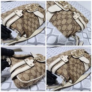 This authentic Gucci Horsebit Chain Flap Shoulder Bag Brown/Beige/Cream is in its good pre-owned condition. The exterior is clean but it shows some sign of rubbing wear and scratches to the edges of the bag. The interior is clean. The shoulder strap shows a little sign of rubbing to it. Gold hardware shows some sign of scratches to it. Kindly look at pictures above for all details.