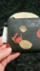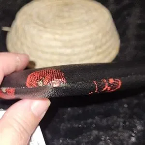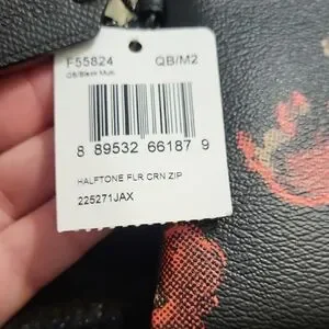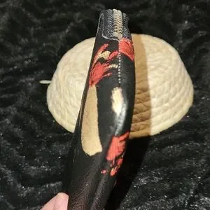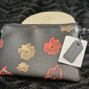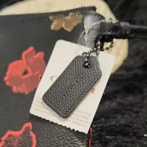 Compact Coach wristlet with zip closure and wrist strap. Black leather-like body with red and beige floral prints. Silver Coach logo accent on front. Sleek and versatile for everyday use.