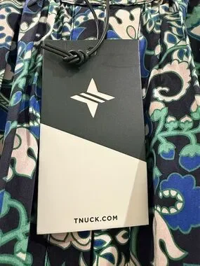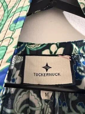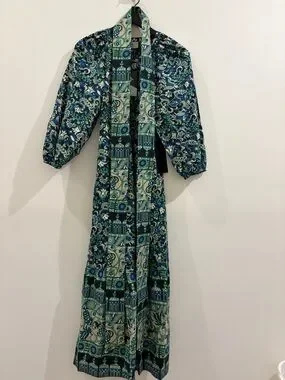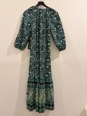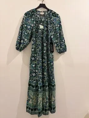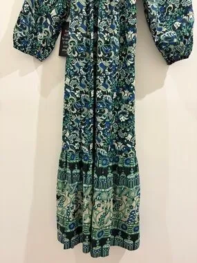 Tuckernuck Lyles Dress Green Batik Floral Puff Sleeve Belted Midi Size M NWT