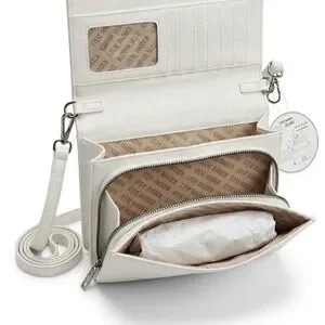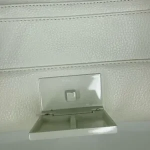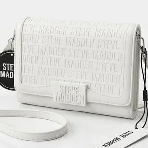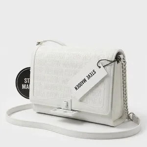 Compact white crossbody with embossed Steve Madden logo. Chain-accent strap and secure front clasp. Sleek, structured silhouette for versatile wear.