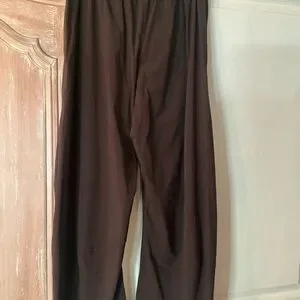 Wide-leg brown pants with an elastic waistband. Soft, drapey fabric for everyday wear. Simple, versatile silhouette. Tag visible but brand not legible.