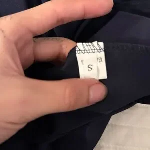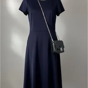 Navy blue fit & flare dress, size S. Soft Y2K minimalist A-line style with short sleeves and flattering silhouette. Lightweight polyester. Please note: no measurements available—review fit carefully.
