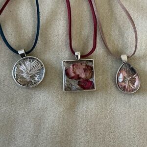 Set of three handcrafted women’s pendant necklaces featuring floral designs. Each pendant hangs on a coordinating cord for easy styling.