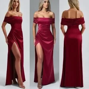 Going out? Enter Gwendolyn, your new favourite gown cut from our luxury stretch satin fabric. Made with an internal boned corset for a snatched waist, the design has a gathered bardot neckline with pleat detailing to the body. The skirt falls to an elegant maxi length, detailed with a wrap over style and thigh high split.