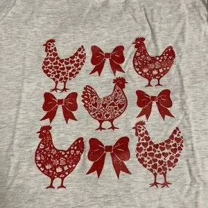This charming, light gray t-shirt features an original red graphic print design with a 3x3 grid pattern of chickens and bows. The chickens are detailed with heart and botanical patterns, giving it a unique, "coquette" or rustic farm aesthetic.