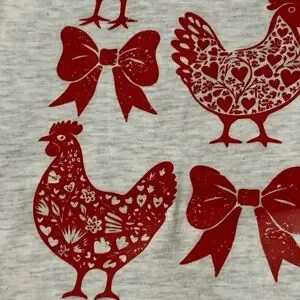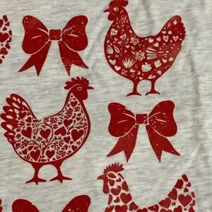 Great soft tee with red hearts and red country hens chickens and red bows.