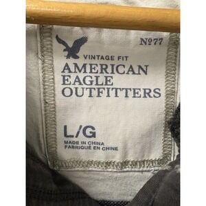 The American Eagle Outfitters Vintage Fit Henley Sweatshirt in gray is a stylish and comfortable addition to any man's wardrobe. Made of cotton knit fabric, this long sleeve sweatshirt features a crew neck and button closure for a classic look. The regular fit and size large make it perfect for everyday wear, while the graphic print adds a touch of personality. Ideal for the colder seasons of winter, fall, and spring, this pullover sweatshirt is machine washable for easy care.