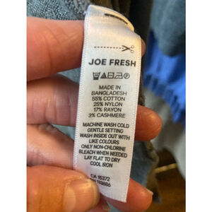 This is a gray Joe Fresh cardigan in size M/M. It is made of 55% cotton, 25% nylon, 17% rayon, and 3% cashmere. It has two pockets and is in pre-owned condition.