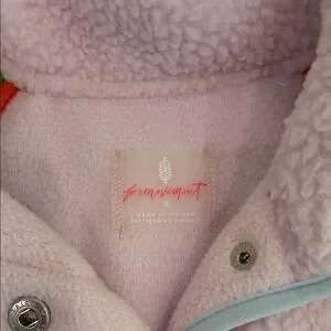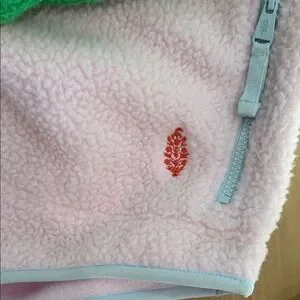 Cozy fleece sweatshirt. Green sleeves with pink body. Orange and blue accents.